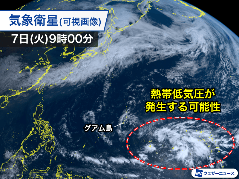 さらに南に行くと、グアム島の東に積乱雲の塊がいくつかみられ、少しずつまとまってきました。現時点では渦が明瞭ではないため、低圧部として解析されています。
