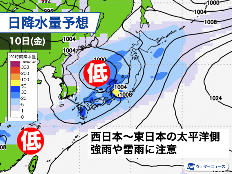 金曜日は太平洋側を中心に強雨や雷雨に注意