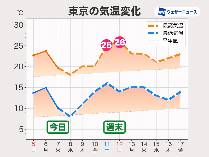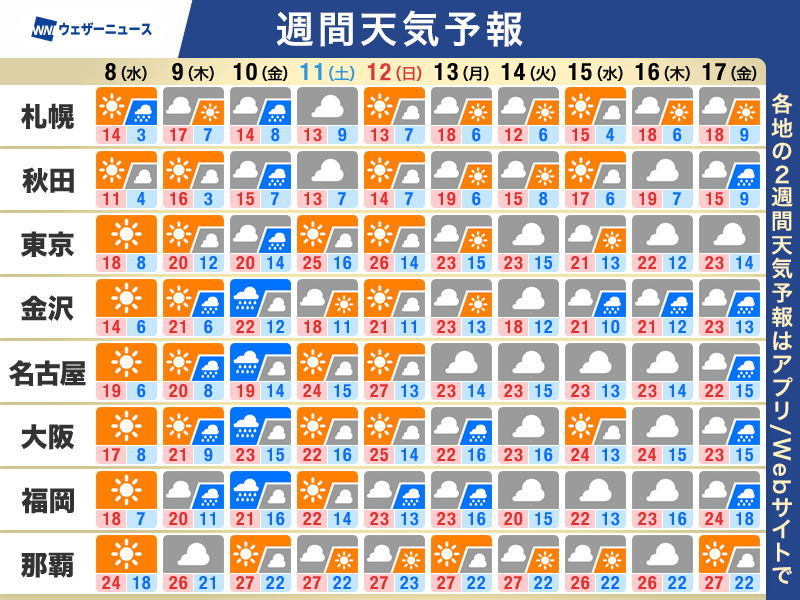 寒さは長くは続かず、その後は再び平年より高めの気温で推移するとみられ、次の週末は東京・名古屋・大阪でも夏日予想となっています。