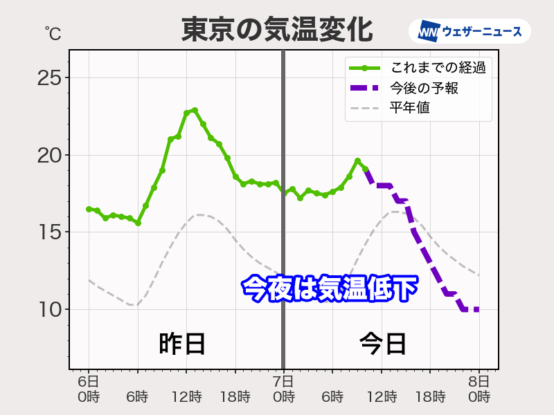 東京都心では夜になると10℃前後まで気温が低下する見込みです。夜でも暖かいくらいだった昨日に比べると7〜8℃ほど低くなります。