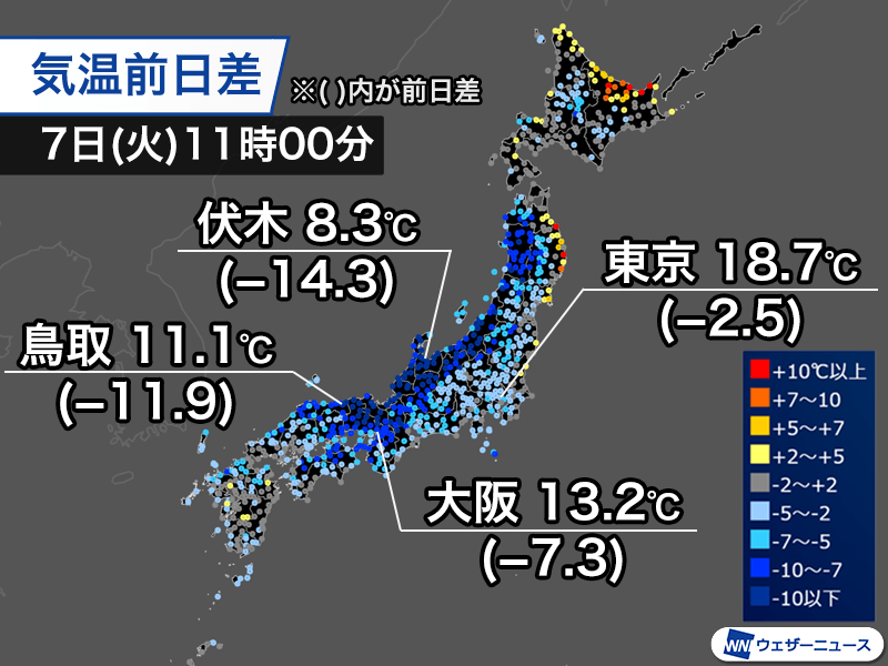 近畿や東海、関東なども気温の上がり方は鈍く、大阪市は昨日より7.3℃低い13.2℃、東京都心は2.5℃低い18.7℃となっています。