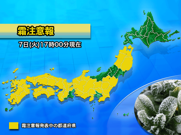 西日本の全域や東日本の広い範囲、東北北部には霜注意報が発表中です。農作物の管理には十分に注意をしてください。観葉植物が影響を受ける可能性もありますので、寒さに弱い植物は室内に取り込むなどの対応が必要です。