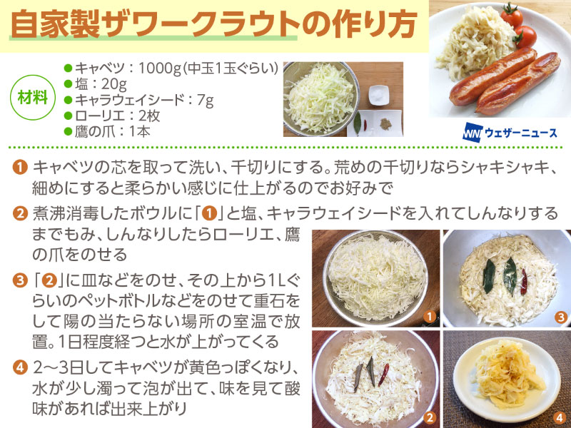 「ザワークラウトは、家庭でも気軽に作れる漬物です。本場では香りづけにキャラウェイシードを加えることが多いですが、なくても味わいは大きくかわりません。無理に用意しなくても大丈夫です。