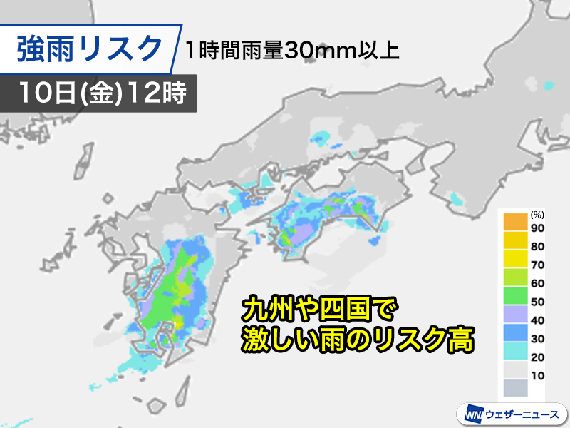 九州、四国などで1時間30mm以上の激しい雨