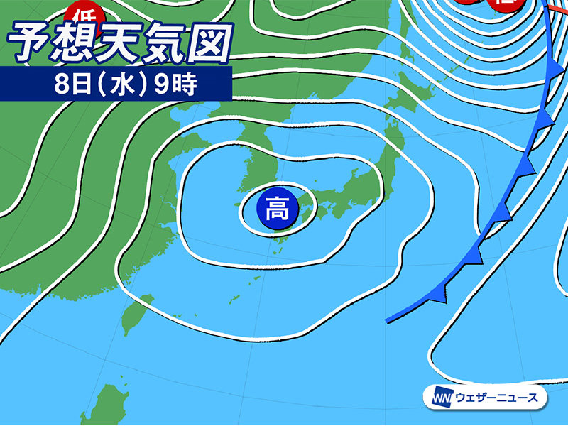 西日本、東日本は高気圧に覆われて晴天となります。