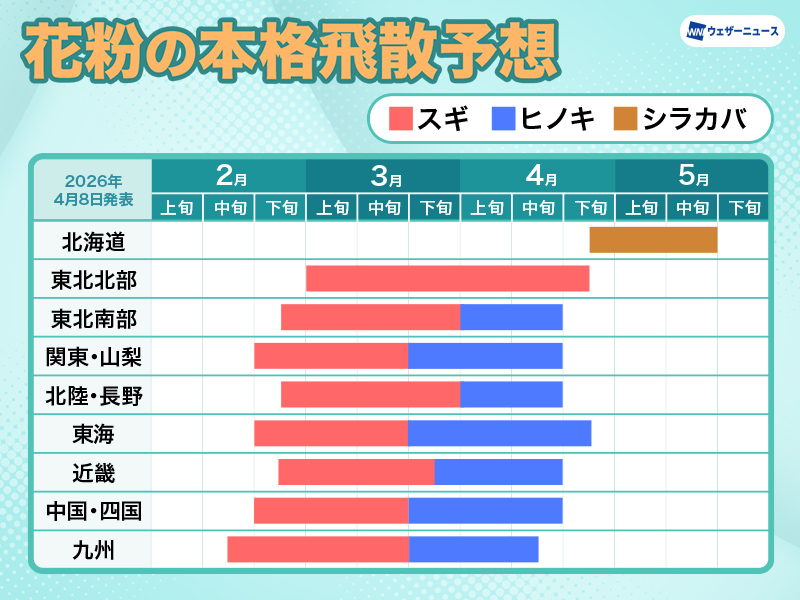本格的な花粉の飛散は九州北部から関東では4月中旬ごろまで、東北では4月下旬ごろまで続く見込みです。