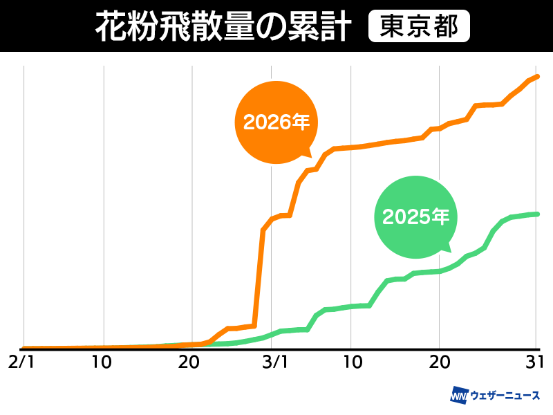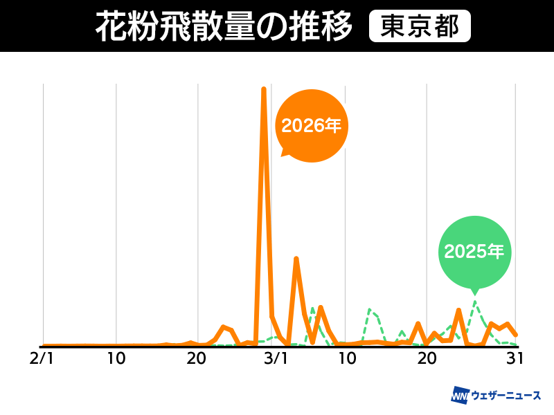 東京都でも、2月28日の記録的な大量飛散の影響で前年比で202%となりました。花粉の本格飛散時期であったことに加えて、気温の上昇や風が強まったことが要因と考えられます。