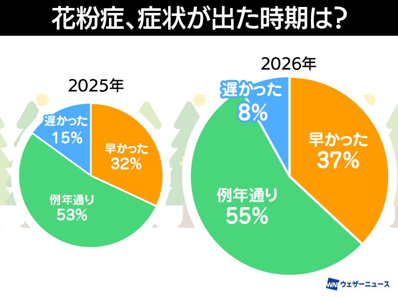※スマホアプリ「ウェザーニュース」にて「今年の花粉症、症状が出た時期はどう?」と質問し(選択肢:“早かった”“例年通り”“遅かった”“花粉症ではない”)、“花粉症ではない”の回答を除いて集計(調査日:2026年3月31日、回答数:8,302)。