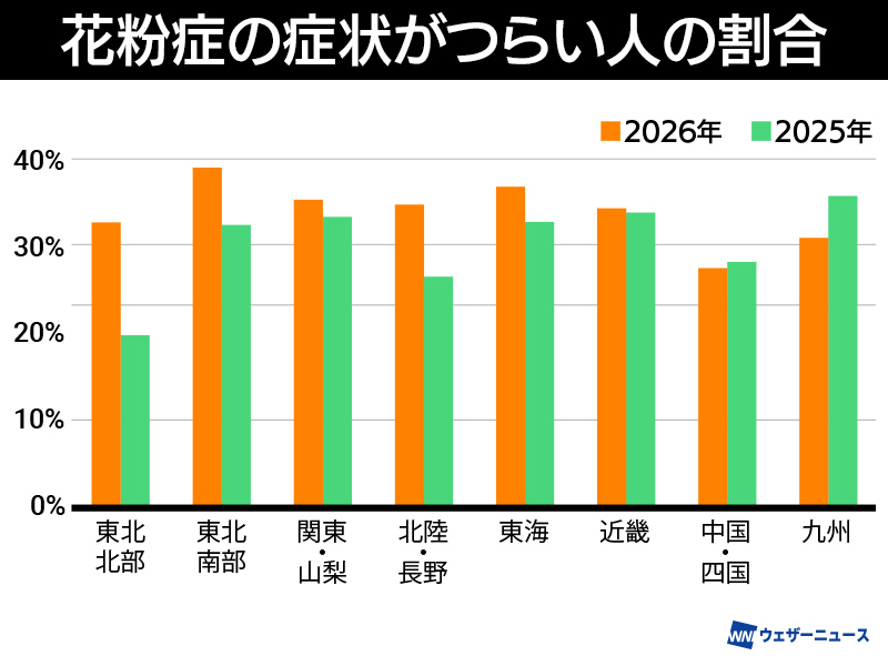 一方、東北を中心に増加が目立ち、東北北部では13ポイント、東北南部でも5ポイント以上増加しています。北陸や長野県でも同様に増加し、前年よりも症状のつらさを感じた人が多くなりました。