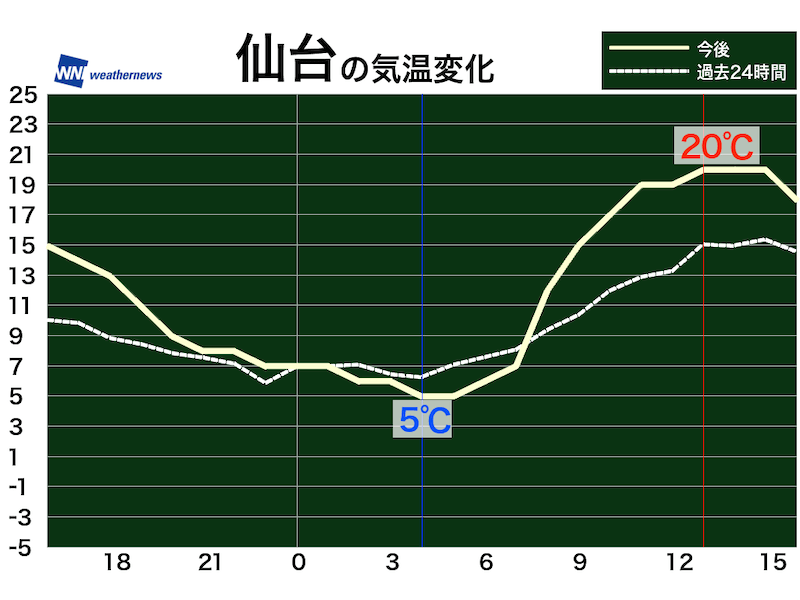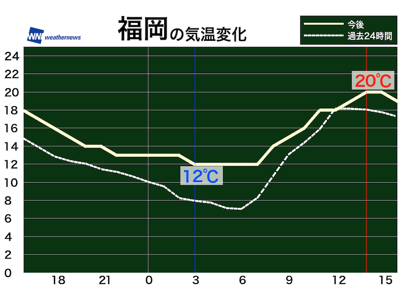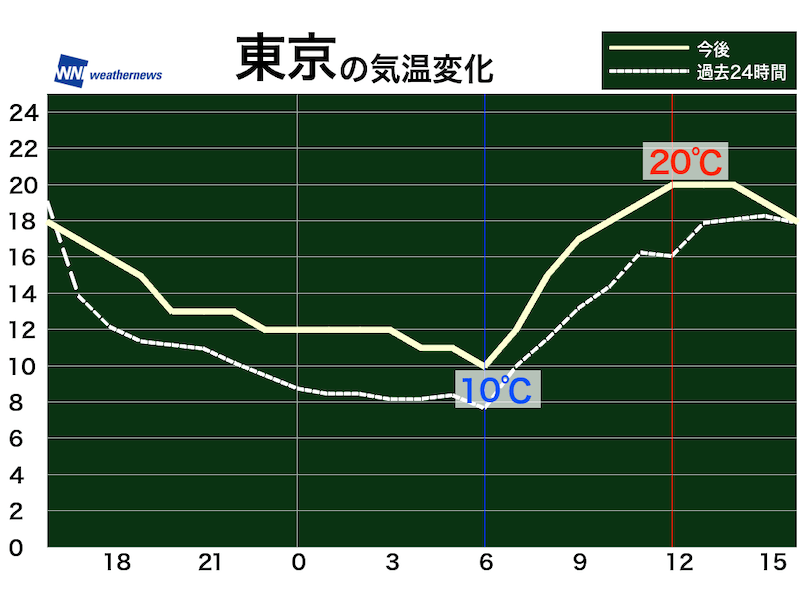 昼間にかけて今日より高めで推移し、20℃くらいまで上がる予想です。