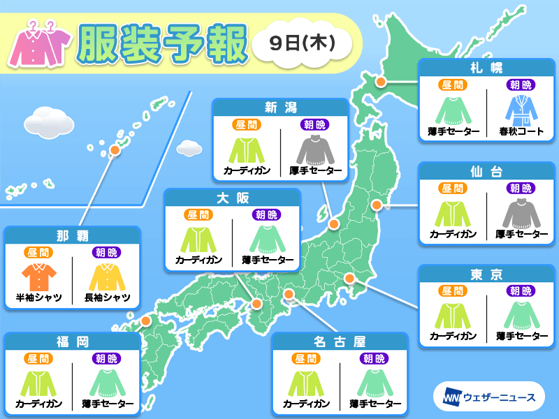 今日と明日の気温変化を比較して、気温に適した服装をご提案します。ウェザーニュースの服装予報もご活用ください。