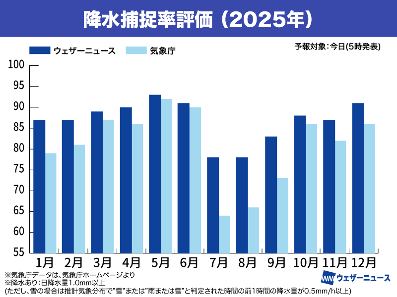 ウェザーニュースの2025年の一年間を通じた降水捕捉率は、87%となりました。