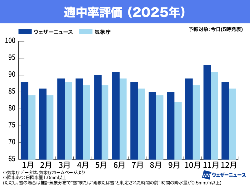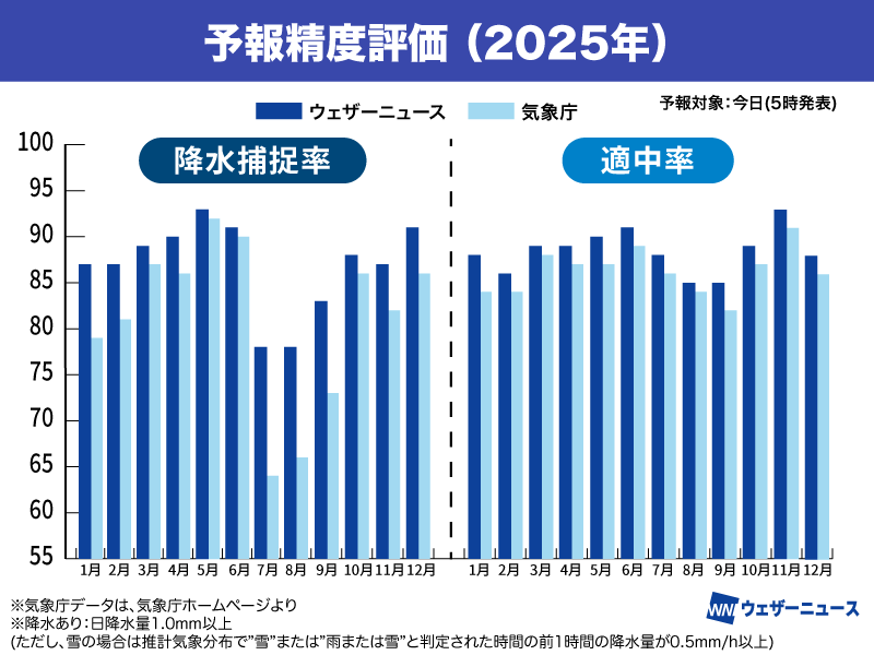 以上の結果から、2025年は降水捕捉率、適中率の両方において高水準を保ち、気象庁の予報精度を上回りました(※1)。