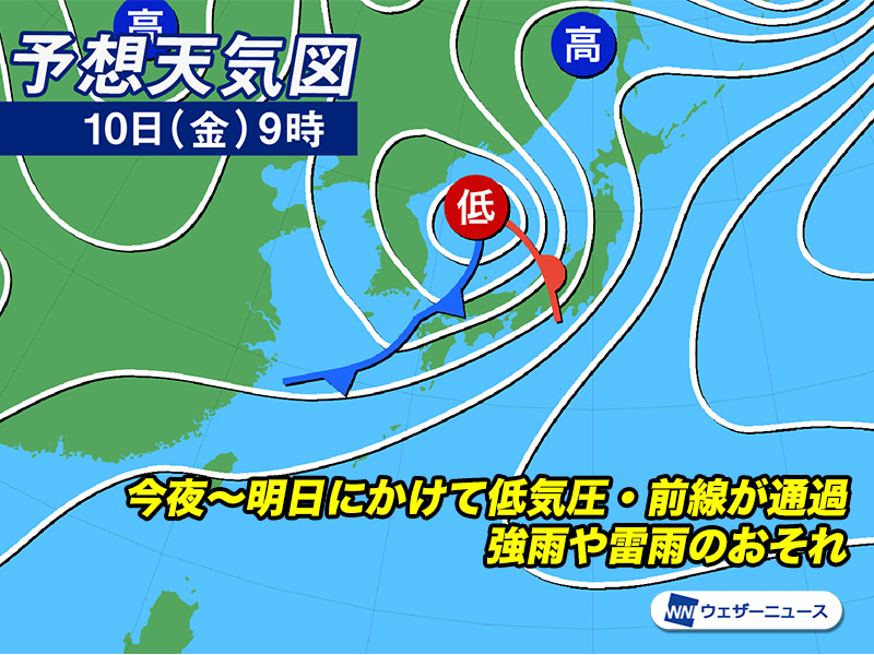 今日は低気圧が近づく西日本から雨が降り始めています。今夜から明日にかけては低気圧や前線が通過し、全国的に雨が降る見込みです。西日本を中心に雷を伴った激しい雨となるおそれがあり、注意が必要です。