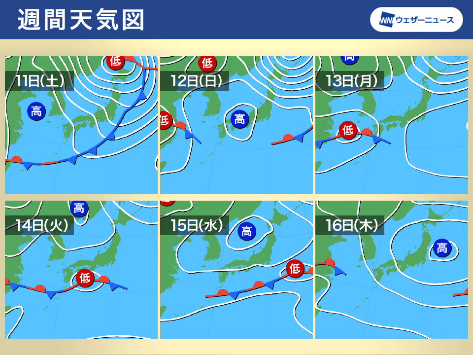週末11日(土)は発達した低気圧がオホーツク海へ進みます。北日本では日本海側を中心に雨が降り、沿岸を中心に風の影響が長引く可能性があります。一方、西日本や東日本は天気が回復して晴れるところが多くなります。