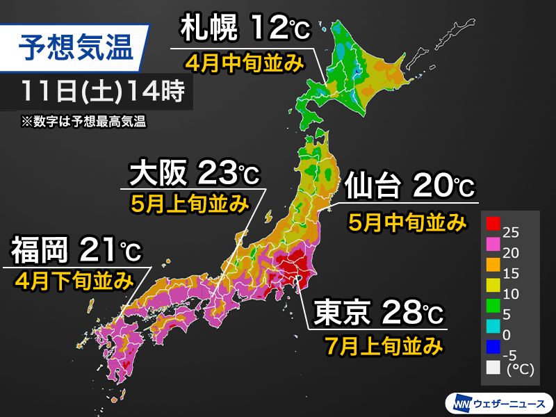 特に週末は高温のピークとなる見込みで、11日(土)は東京都心で28℃と7月上旬並みの予想となっています。この時期としては異例の暑さです。