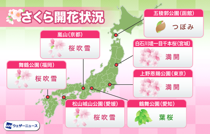 一方、東北は南部で見頃を迎えており、北部も続々と開花が進んでいます。開花から満開までの進みが早いため、タイミングを逃さないよう、早めに計画を立てておくと安心です。