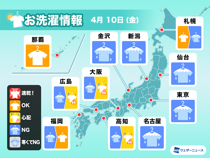 東北や北海道も次第に雨が降り出し、夜にかけてスッキリしない空が続くため、外干しは控えた方が良さそうです。