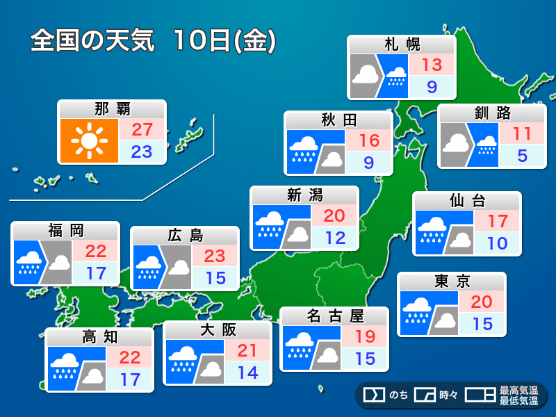 明日10日(金)は全国的に天気が崩れますが、雨が降っても気温は高めです。明日の予想最高気温は、福岡22℃、広島23℃、大阪21℃、名古屋19℃、東京20℃となっています。