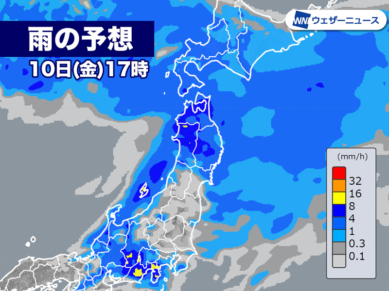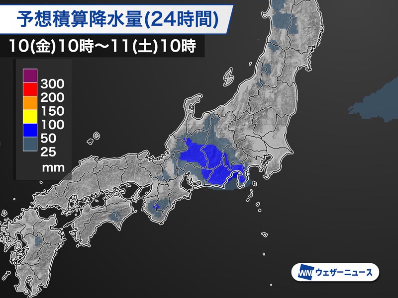 今日10日(金)は西日本や東海で雨雲が発達し、強い雨が降っています。今朝は長崎県の雲仙岳で1時間に61.5mmの非常に激しい雨を観測しました。朝にかけては九州の所々で激しい雨が降っています。