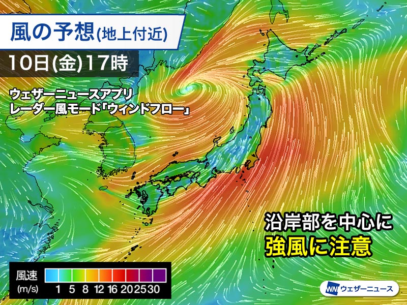 夜にかけても全国各地で、沿岸部を中心に平均10m/sを超えるような強い風が吹く可能性があります。