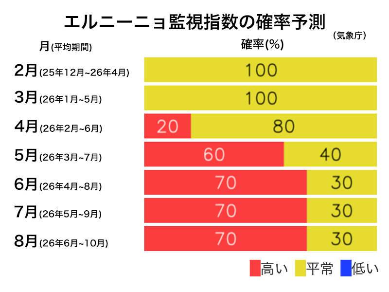 ただし、この時期の春を超えるエルニーニョ現象の予測は不確実性が大きくなっています。現時点では春の間は平常の状態が続く可能性もある(40%)ものの、エルニーニョ現象が発生する可能性の方がより高くなり(60%)、夏にはエルニーニョ現象が発生する可能性の方が高くなる予想(70%)です。