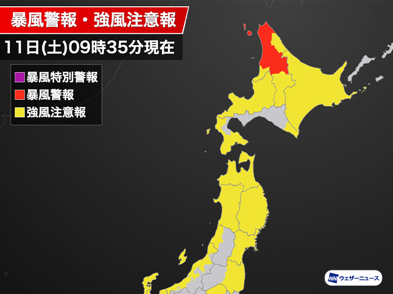 午前9時35分現在、北海道・道北エリアでは暴風警報が発表中です。