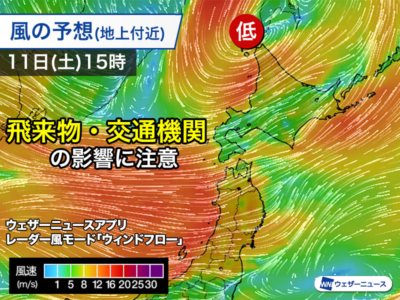 風の強い状態は明日12日(日)まで続く見込みです。飛来物や交通機関への影響にご注意ください。