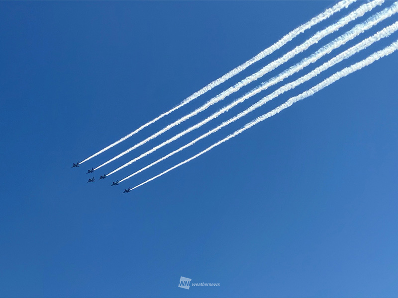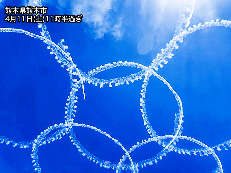今日11日(日)、西日本や東日本は朝から晴れて、行楽日和となっています。熊本県でも青空が広がり、展示飛行ではブルーインパルスの白いスモークが青空に鮮やかに映え、コントラストの美しい光景が広がりました。