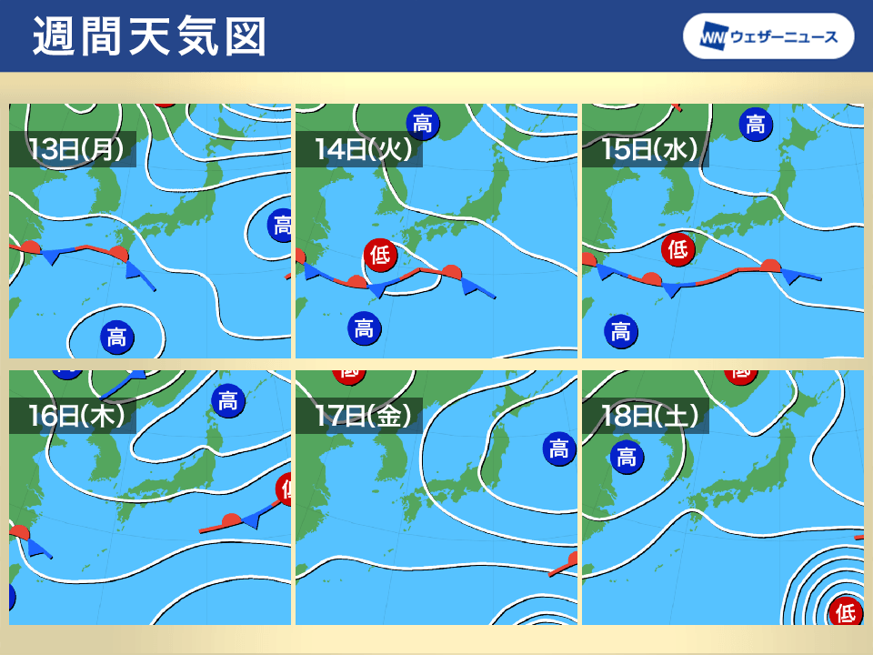 13日(月)から15日(水)頃にかけては太平洋側を中心に雨が降りやすく、その後も湿った空気の影響でスッキリしない天気が続きます。雨の降るエリアや強さには予測にブレがあるため、外出の際は折りたたみ傘が手放せない一週間となりそうです。