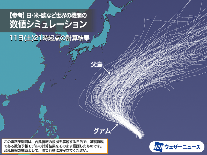 これらを比較すると、はじめのうち北西に進んだあと、北東に進路を変える予測が揃っていると読み取れます。ただ、小回りと大回りの予測で幅があり、まだ不確実性が大きいといえそうです。大回り(西寄り)だと小笠原諸島への影響が大きくなりますが、現時点では小回り(東寄り)の予測が増えている傾向があります。日がたつにつれて誤差はさらに縮小する見込みです。