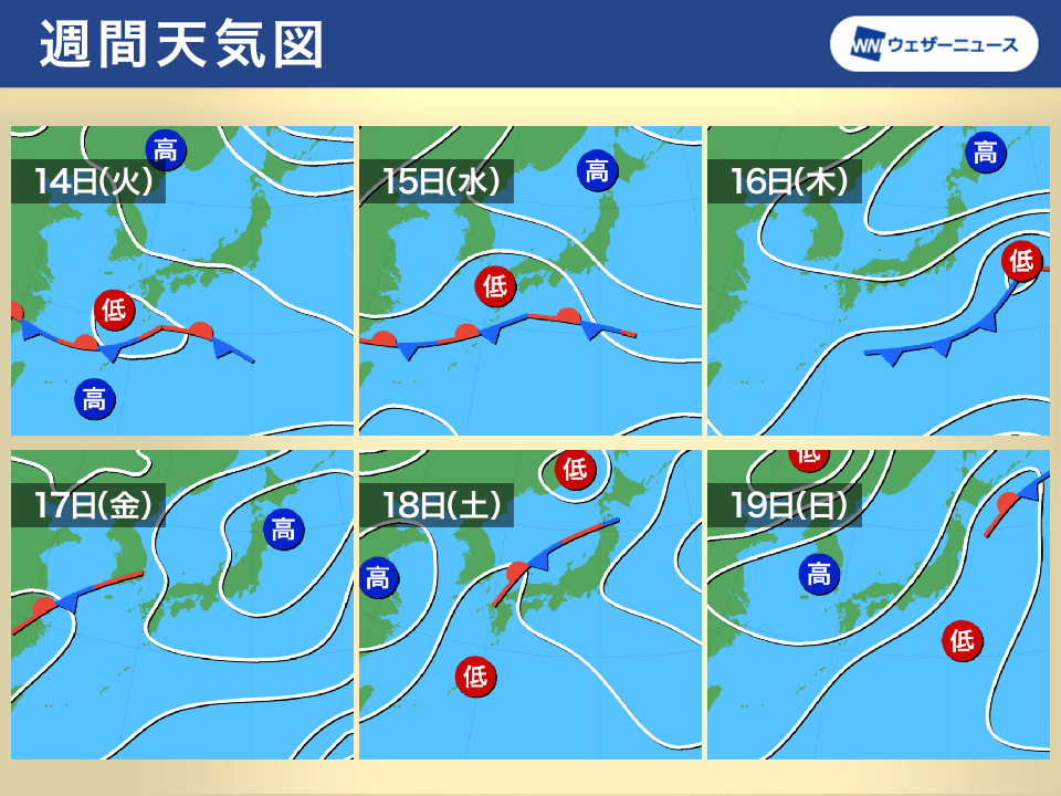 14日(火)以降は本州の南岸に前線が停滞するため、西日本や東日本では「菜種梅雨」を思わせるようなぐずついた空が続く見込みです。