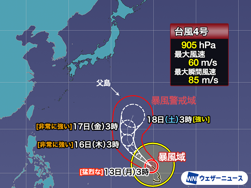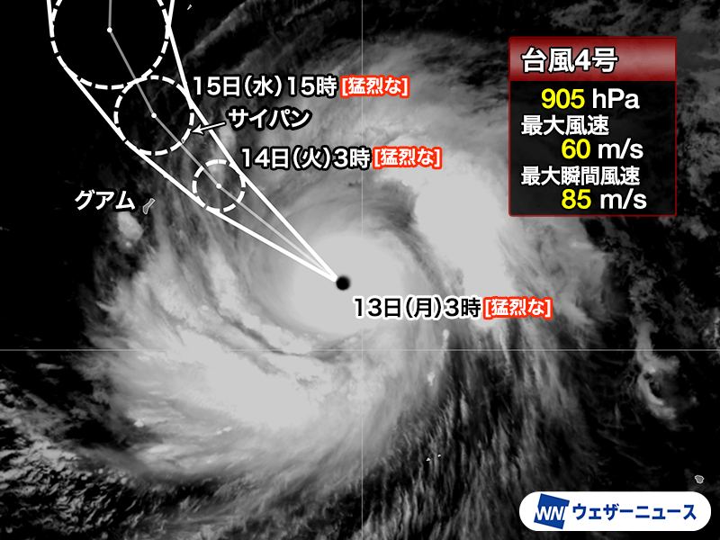 台風4号(シンラコウ)急発達 中心気圧905hPaの猛烈な勢力に 台風の目がくっきり