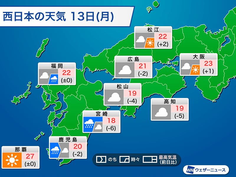 最高気温は、熊本や広島で21℃、松山で4℃下がり19℃、大分や宮崎で5℃前後下がり18℃の予想です。