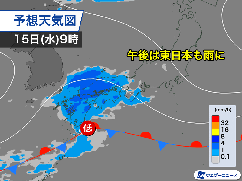 明後日15日(水)は雨の範囲がさらに東へと拡大します。