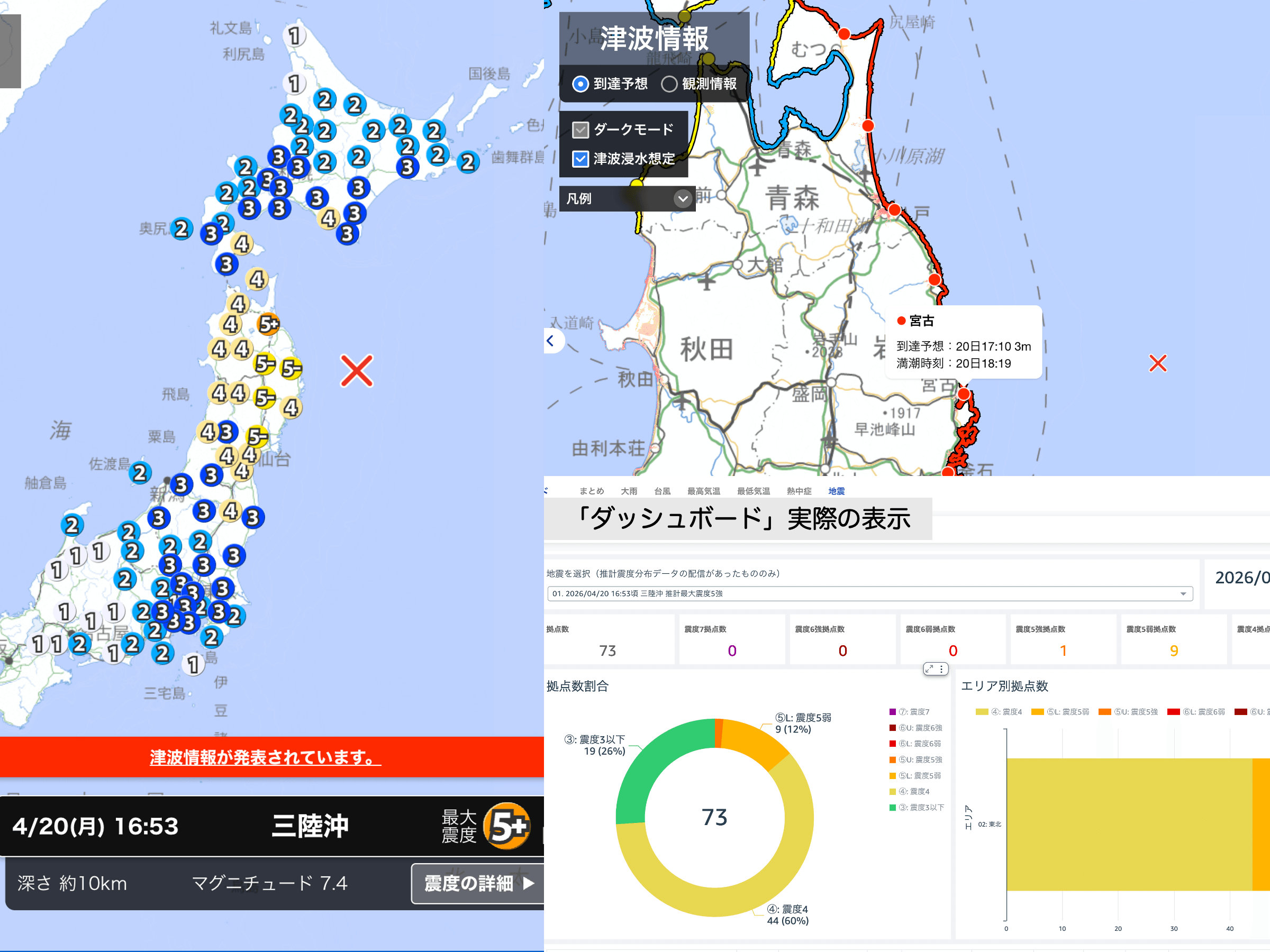 4月20日(月)午後4時53分頃、三陸沖を震源とするマグニチュード7.7の地震が発生。震度5強を青森県の階上町で観測したほか、北海道から近畿地方にかけて揺れを観測しました。三陸沖を震源とする、最大震度が5強以上の地震は、2011年3月の東日本大震災以来初めてです。