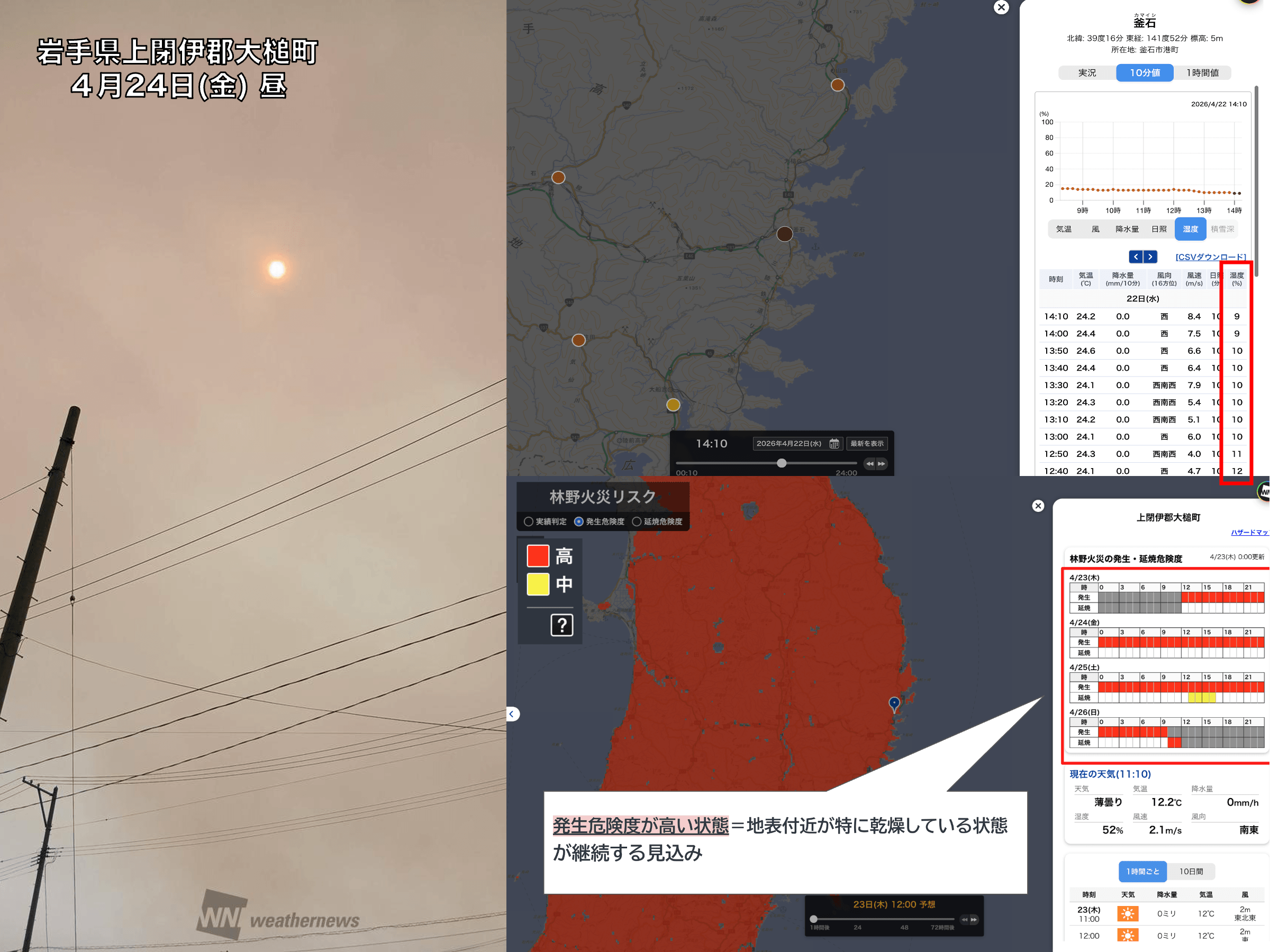 また22日(水)は、東北地方の太平洋側でフェーン現象が発生。湿度が10%前後と極度に乾燥した状態となり、岩手県大槌町では林野火災が2ヶ所で同時多発的に発生しました。