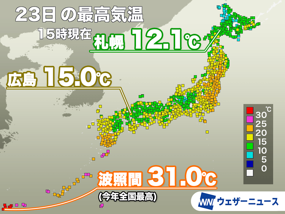 20日(月)は、日本海の低気圧に向かって南寄りの風が吹いたことで、日本海側でフェーン現象が発生し、最高気温は石川県の小松で28.6℃、新潟県の魚沼市小出(こいで)で28.2℃を観測。いずれも平年値より10℃ほど高い値となりました。