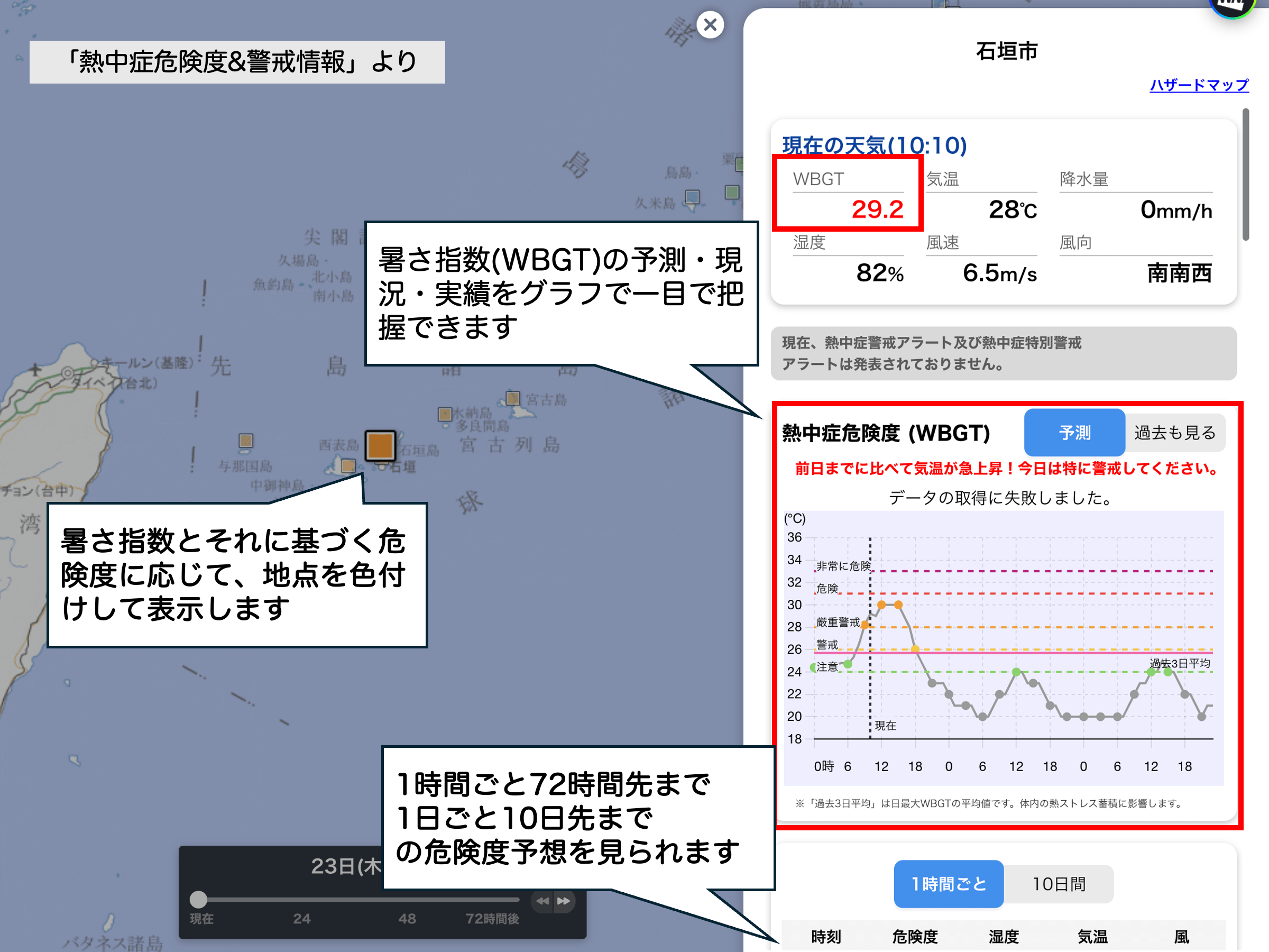 お客様の拠点ごとに、1時間ごとに72時間先までの暑さ指数(WBGT)と、それに基づいた危険度を確認します。特にどの時間帯が熱中症のリスクが高いかを把握することで、事前の安全計画に活用いただけるコンテンツとなっております。