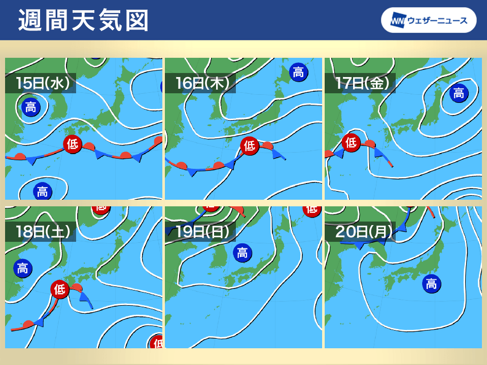 今週は低気圧や前線が日本の南岸を通過する週中頃と週末に広く雲が広がり、西日本や東日本を中心に雨の降る可能性があります。