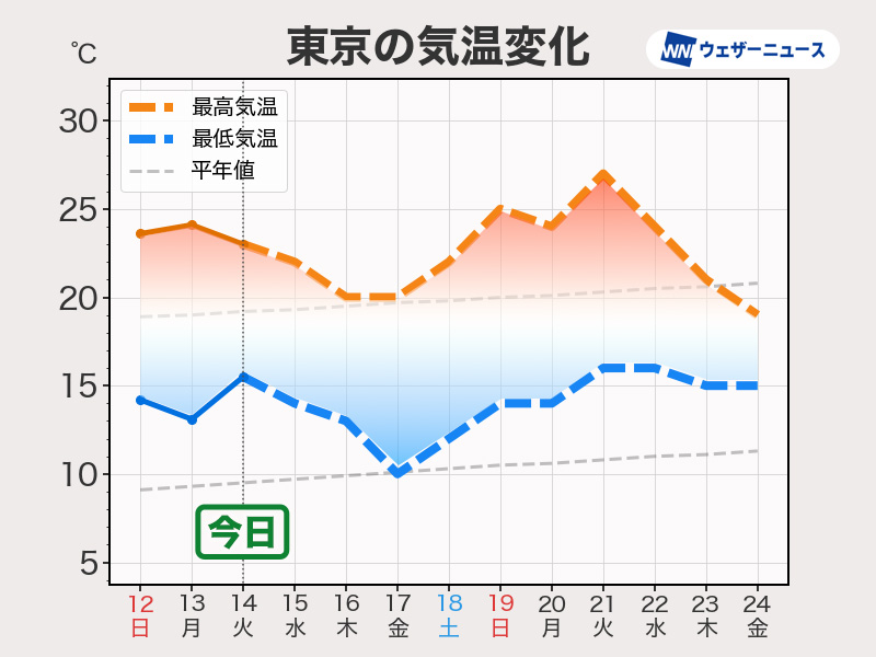 昼間は体を動かすと汗ばむ体感となるため、外出や運動の際は水分補給を忘れずに行ってください。また、朝晩と昼間の気温差が大きくなるため、脱ぎ着しやすい服装を選ぶなど体調管理にお気をつけください。
