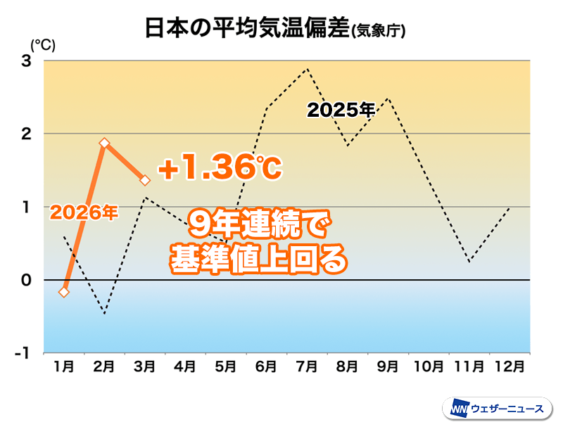 日本の3月は9年連続で基準値より高い