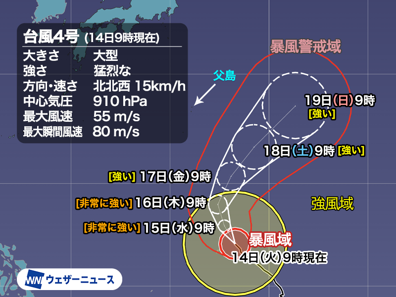 4月14日(火)9時現在、大型で猛烈な台風4号(シンラコウ)はマリアナ諸島を北北西に進んでいます。