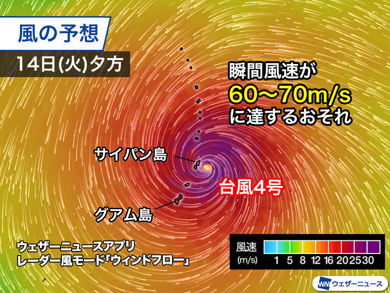 台風4号(シンラコウ)は14日(火)12時の時点で中心付近の最大風速が55m/sと若干、勢力を弱めました。それでも猛烈な勢力は維持し、サイパン島などが台風の暴風域に入っています。