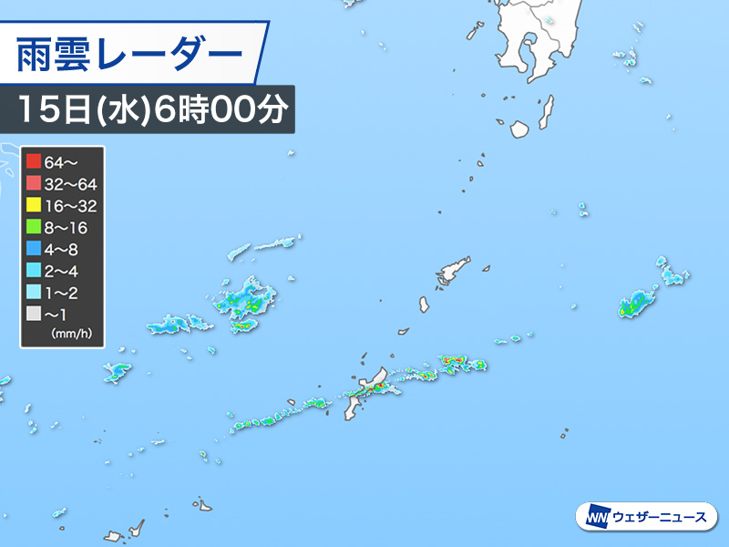 沖縄県のアメダス名護では5時46分までの1時間に31.0mmの激しい雨、鹿児島県・奄美大島のアメダス名瀬では0時56分までの1時間に10.5mmのやや強い雨を観測しています。