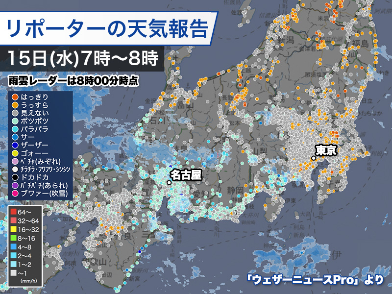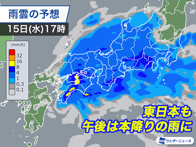 今日15日(水)は西日本から雨の範囲が拡大 午後は東海や関東も本降りに