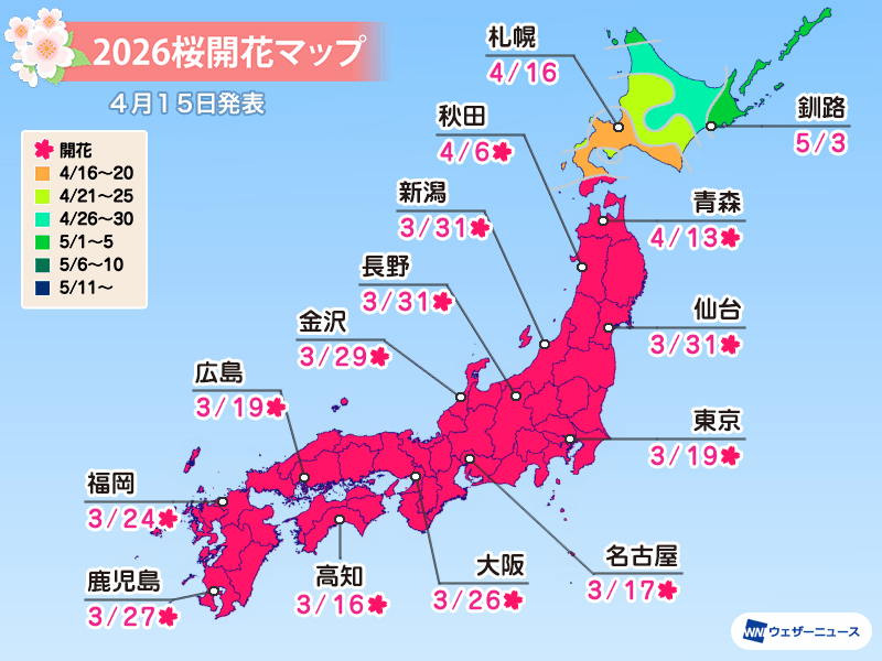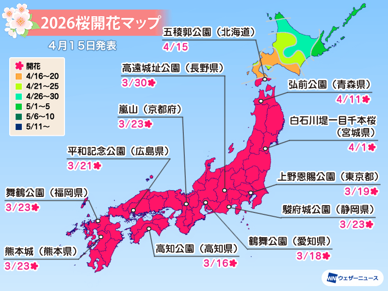 ウェザーニュースでは本日4月15日(水)、2026年の「第十回桜開花予想」を発表しました。