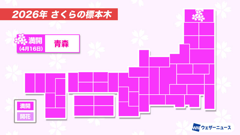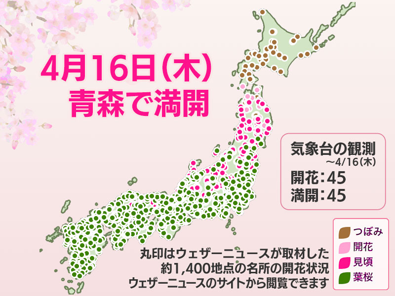 今日の桜開花状況 4月16日(木) 青森で満開発表