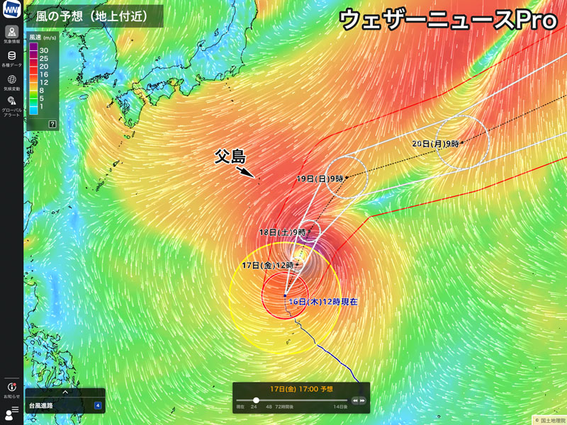 父島などからは離れたところを進むため大雨や暴風の可能性は小さいものの、今日から明日18日(土)をピークにうねりを伴った高波や強風の影響が予想されます。海のレジャーなどはご注意ください。