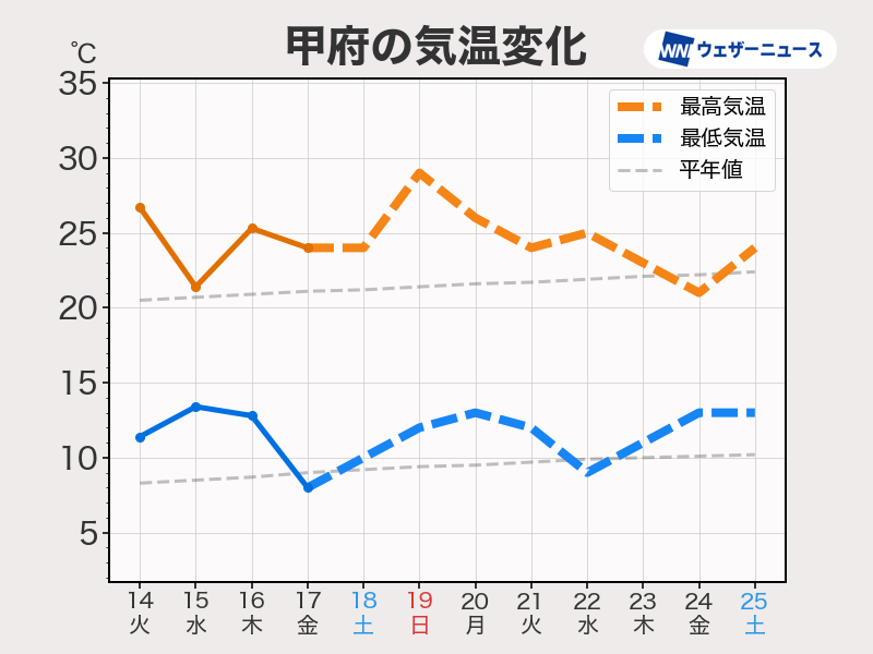 甲府では19日(日)の予想最高気温が29℃で、真夏日に迫る汗ばむ暑さとなりそうです。